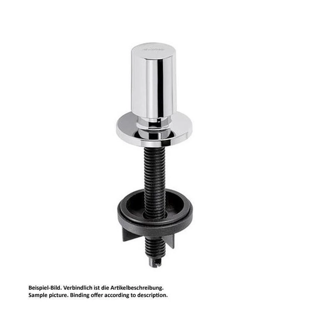 Zugknopf als Bedienelement für Ablauffernbedienung zum Nachrüsten oder Umrüsten der Spüle oder des Spülbeckens. Beispielsweise wenn zur Küchenarmatur in Edelstahl der Zugknopf auch aus Edelstahl passend gewünscht wird (der Standard-Drehknopf ist in der Oberfläche Chrom Glanz), oder der flache, rund Drehknopf gegen einen Zugknopf getauscht werden soll.