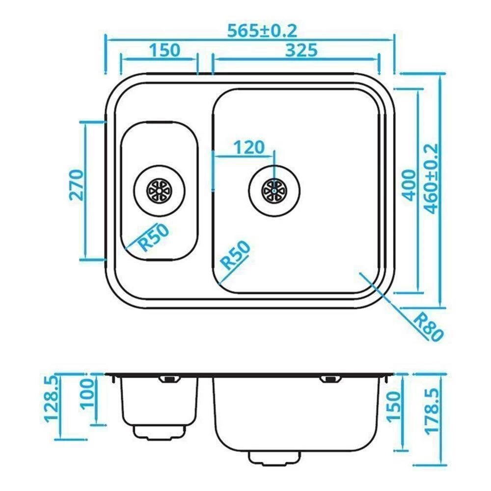 - Beckenabmessung: 325 / 150 x 400 / 270 x 150 x 100 mm