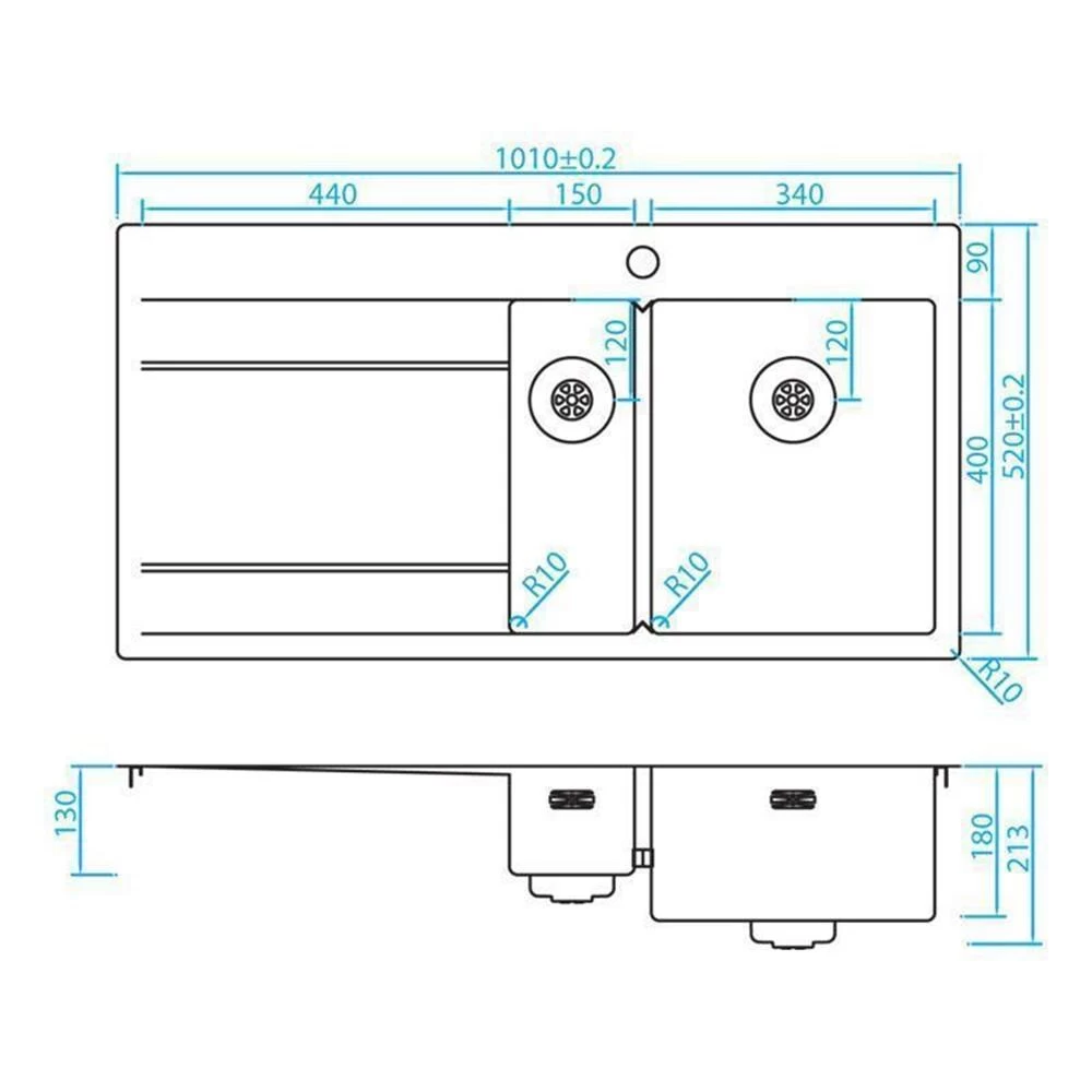 - Beckenabmessung: B 340 / 150 x T 400 x H 180 / 130 mm