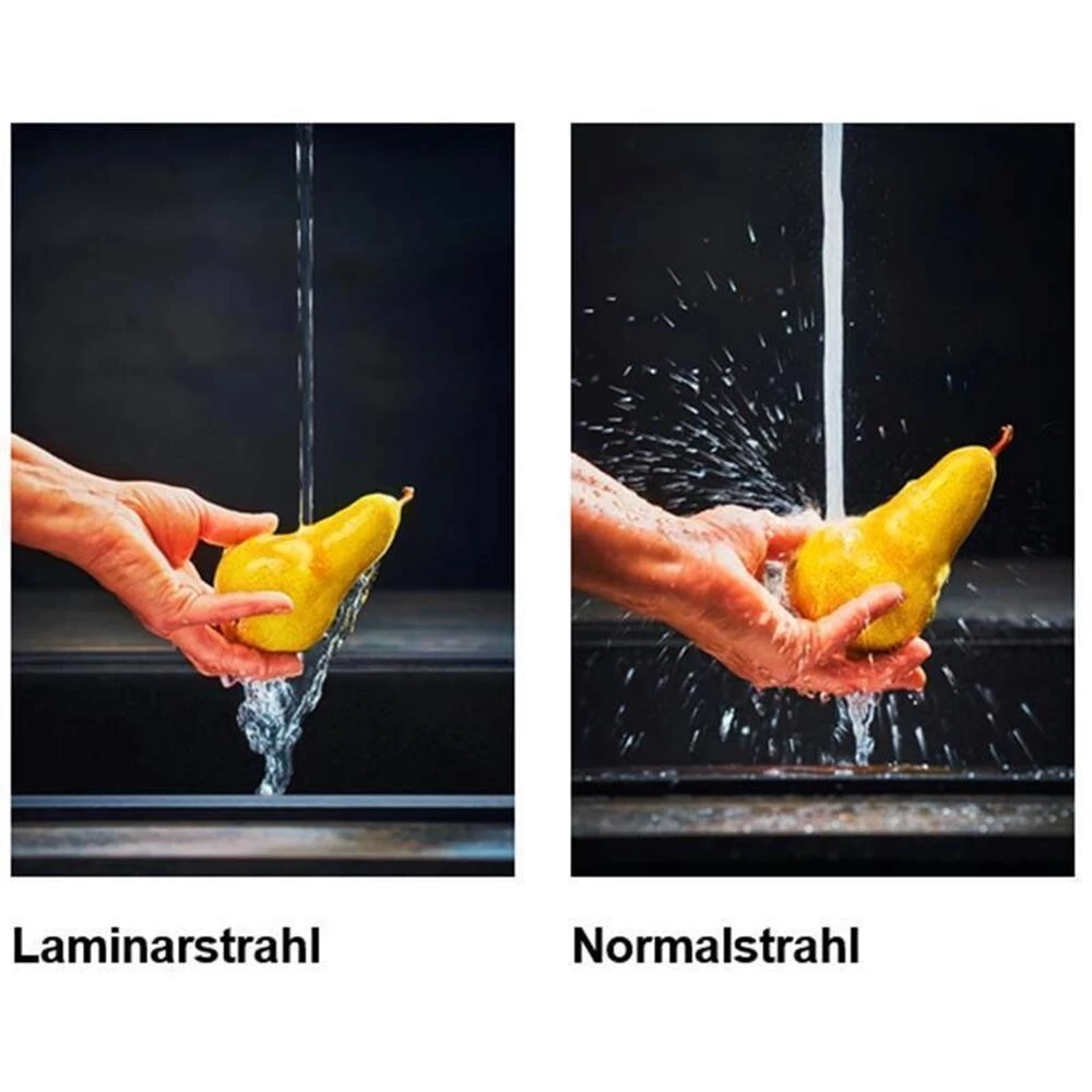 Der kristallklare und sehr leise Wasserstrahl in Armaturen mit Laminar-Strahlregler wird ermöglicht, da er ohne Luftverwirbelung auskommt. Spritzwasser kann so verhindert werden, was die Anwendung in der Küche noch komfortabler gestaltet. Vorsicht beim Abspülen und ständiges Abwischen des Spülenrandes gehören somit der Vergangenheit an. Die Durchlaufmenge wird dabei nicht beeinträchtigt, Sie verbrauchen daher auch nicht mehr Wasser mit dieser Technologie.