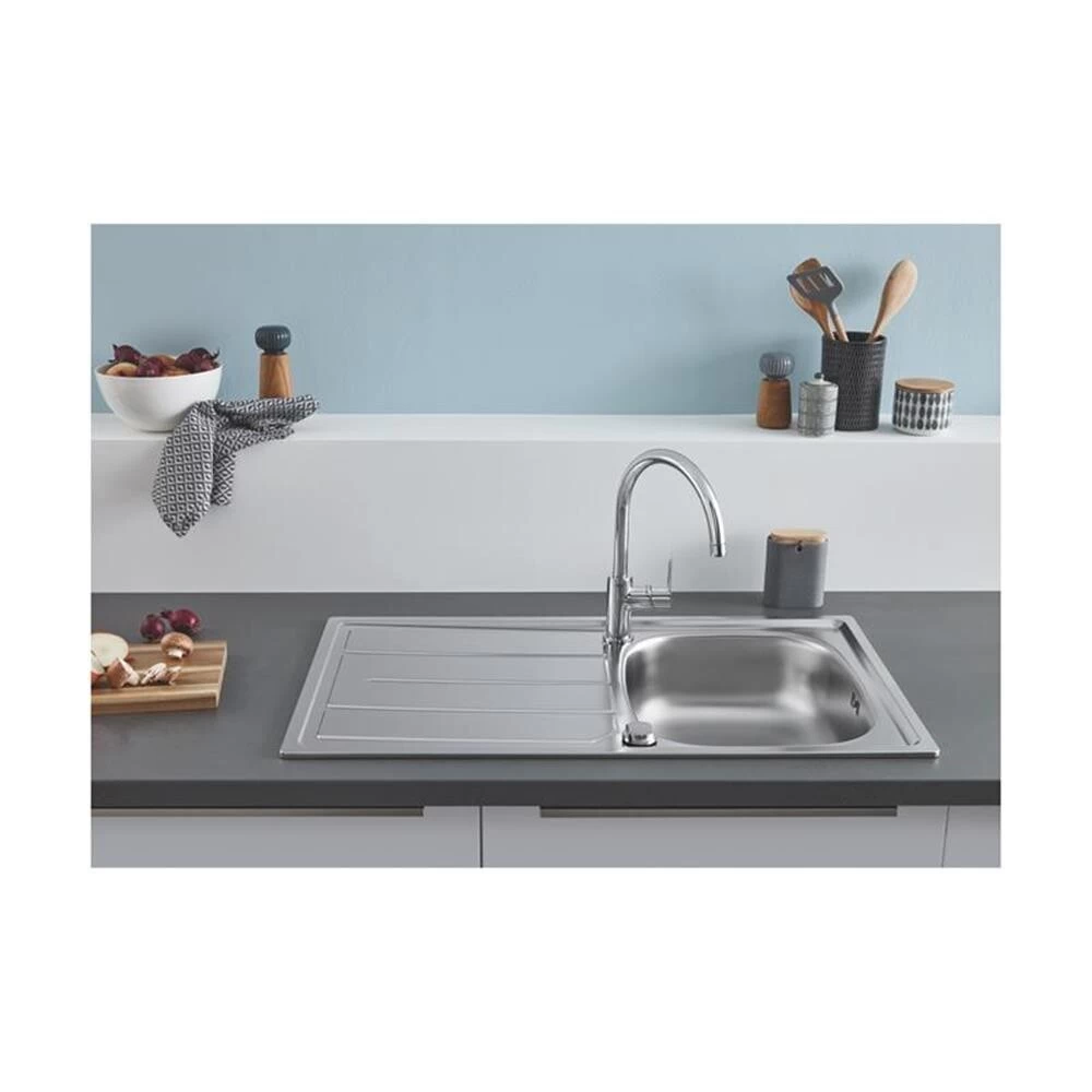 Die Spüle überzeugt durch funktionales Design, Sie hat das GROHE FastFixation Schnellbefestigungssystem. Die Abtropffläche bietet ausreichend Platz.