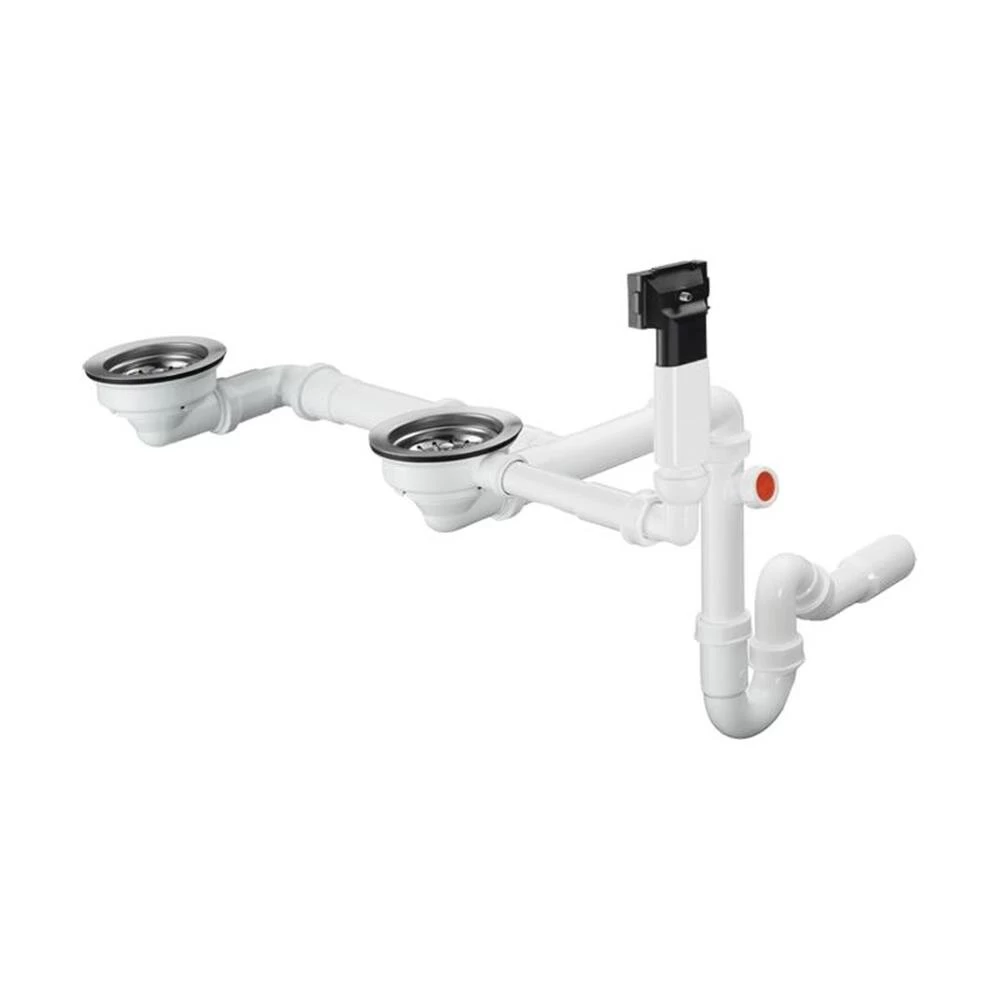 Die D17-10 Manuelle Ab – und Überlaufgarnitur für Doppelbecken besteht aus einer Ab- und Überlaufgarnitur, einem Siebkorbventil und einem Siphon.