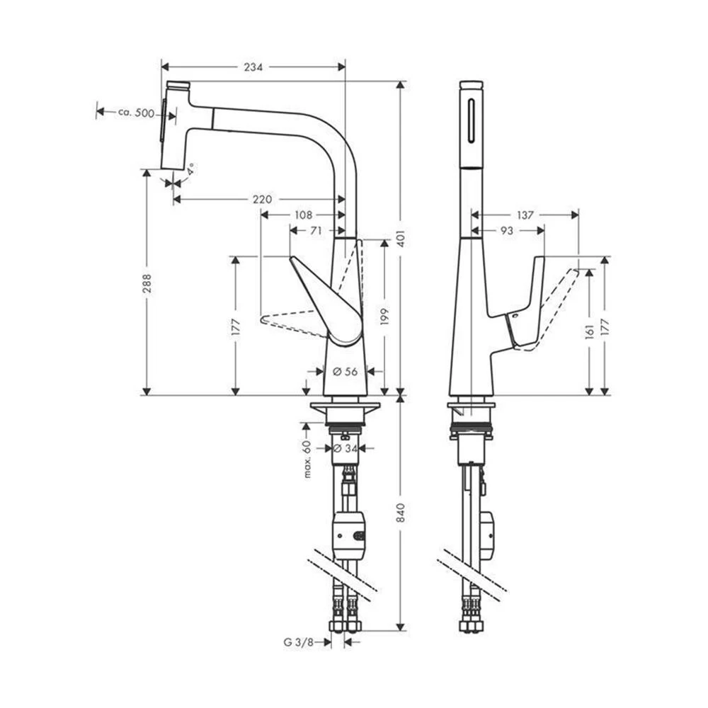 - Ausstattung: ausziehbarer Auslauf / 2 Strahlarten