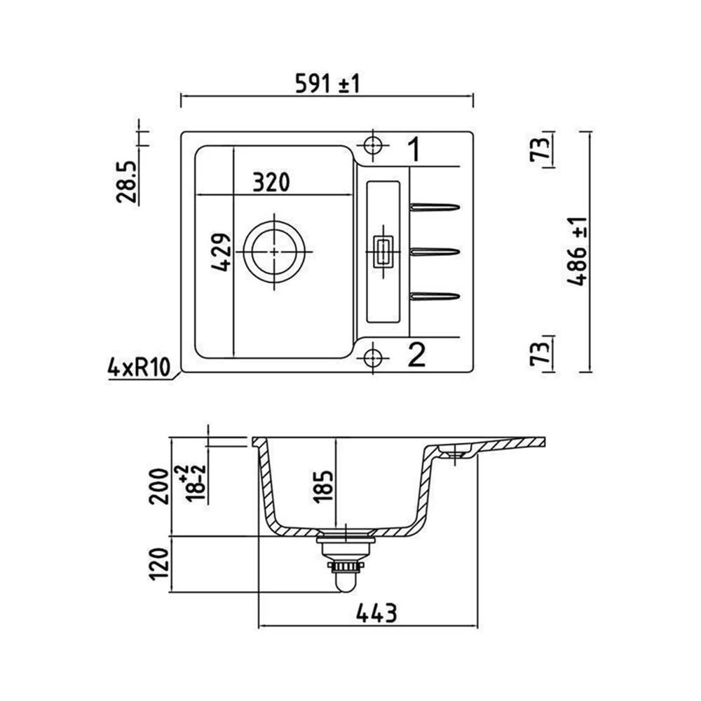 - Ausschnittmaße: B 595 x T 490 mm R 12 mm