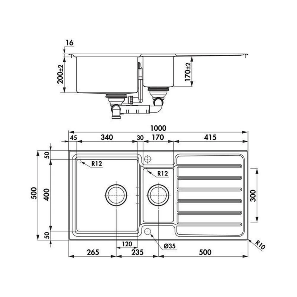 - Ausschnittmaß (Einbauspüle): ca. 980 x 480 mm