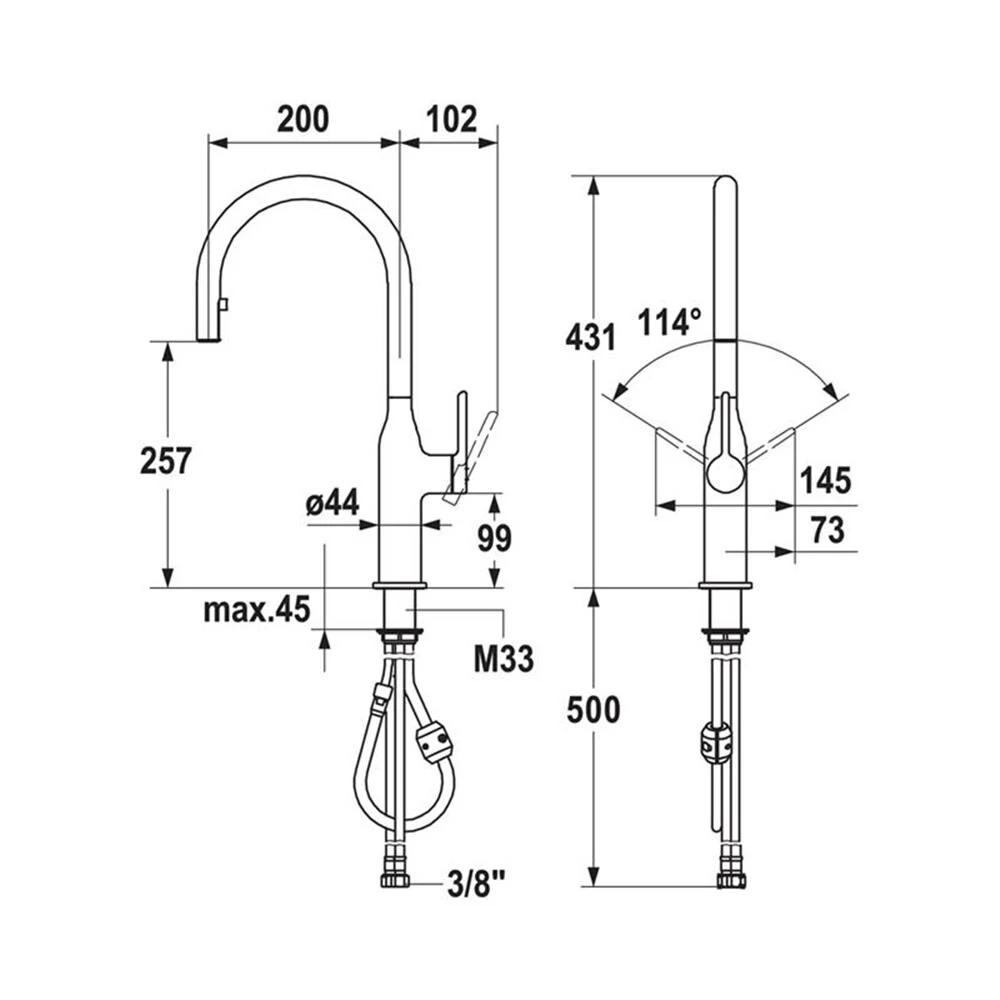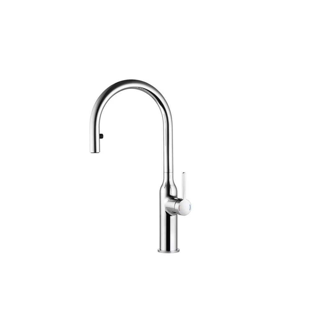 Küchenarmatur Sin 2 mit schwenk-/herausziehbarem Auslauf, seitlichem Hebel und Keramikkartusche.