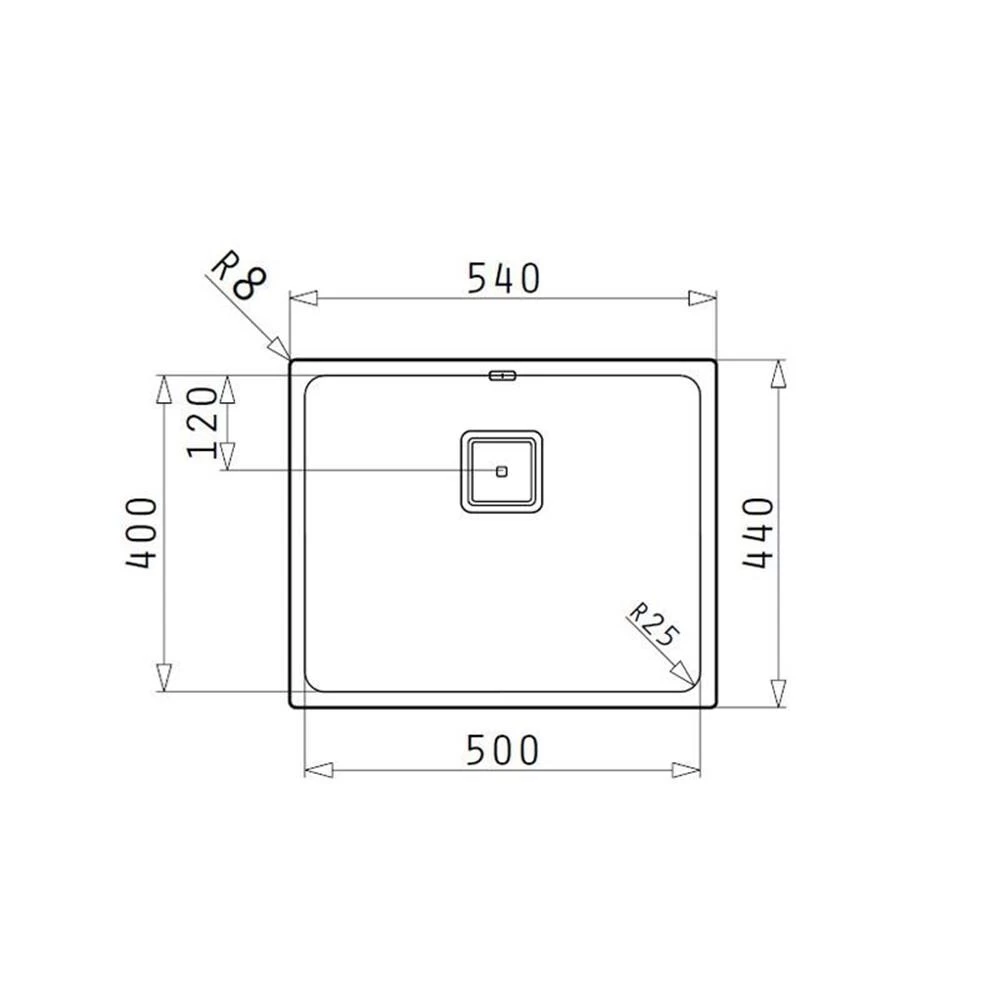 Unterbaubecken mit 25 mm Radius und eckigem Ablauf.