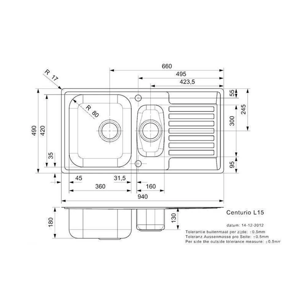 - Spülenmaß: B 940 x T 490 mm
