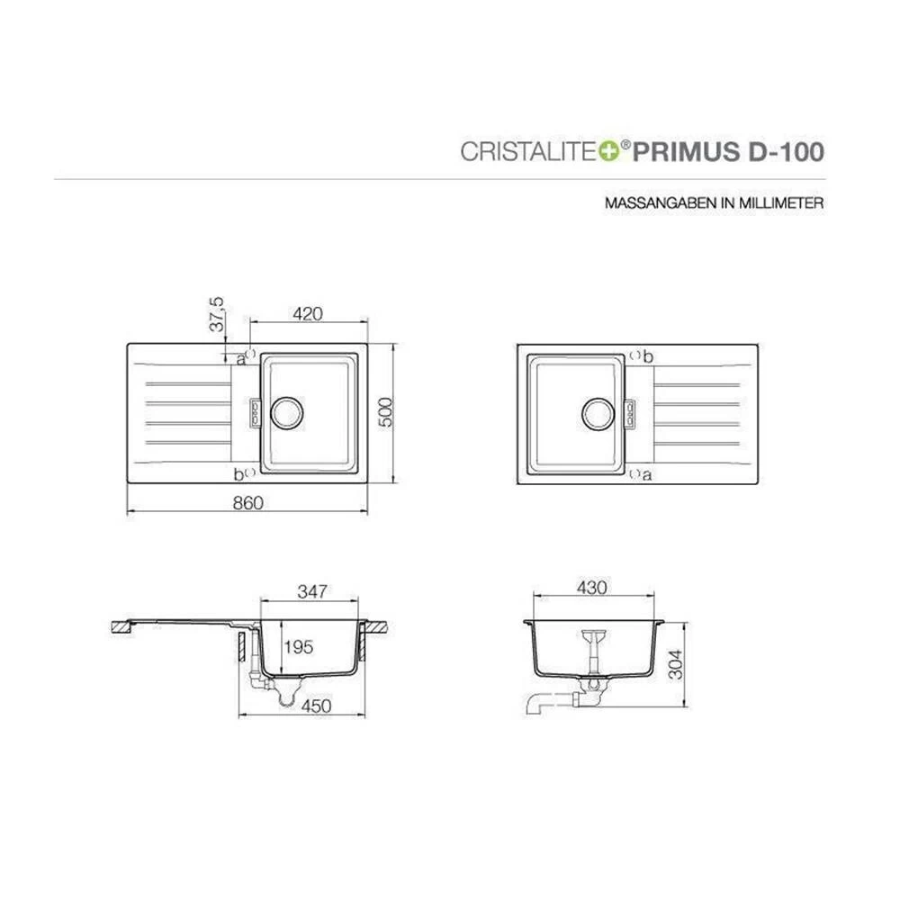 - Beckenabmessung: 347 x 430 x 195 mm