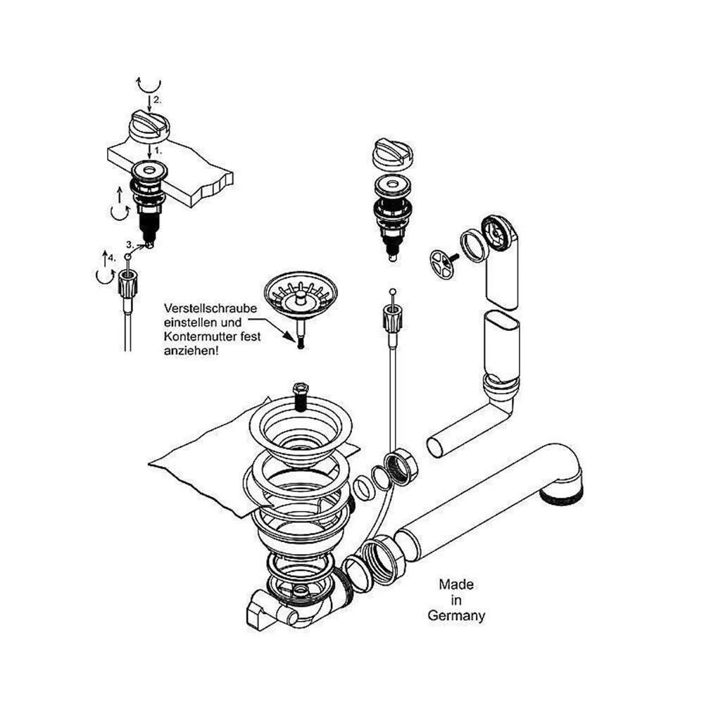 - Lieferumfang: 3,5″ Korbventil für Excenter-Betätigung + Ablauf-Kelch+ Überlauf (Metall-Rosette rund) + Excenter-Betätigung (Drehknopf Oberfläche Chrom Glanz) + Raumsparabgang 1,5″