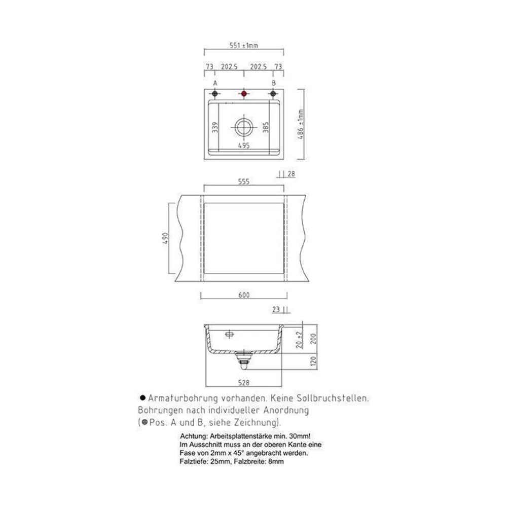 - die Spülen-Randstärke kann von 20 mm auf 10 mm reduziert werden. Falztiefe dann 15 mm / Mindest-Arbeitsplattenstärke 20 mm. Dazu Artikel 9055 (Hersteller-Artikelnummer) bestellen. Beachten Sie dabei bitte die Einschränkungen speziell für Spülen mit Abtropffläche