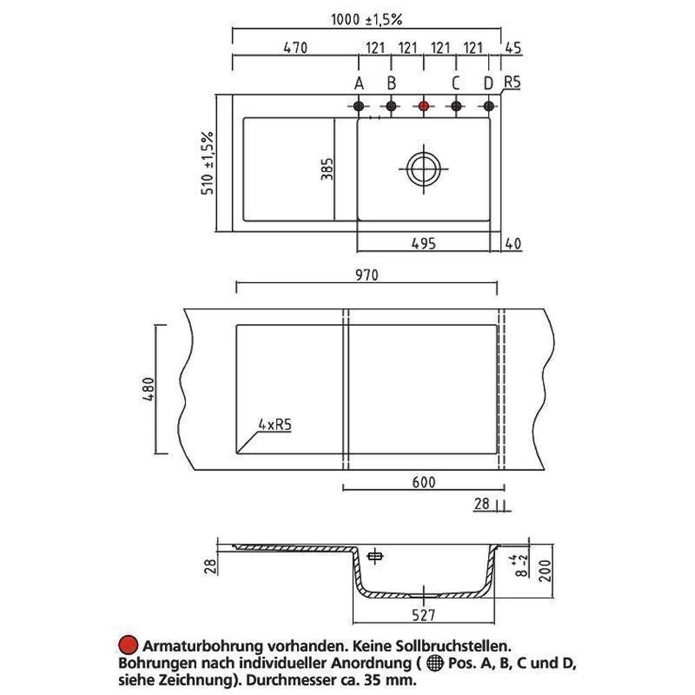 - Spülenmaß: B 1000 x T 510 mm