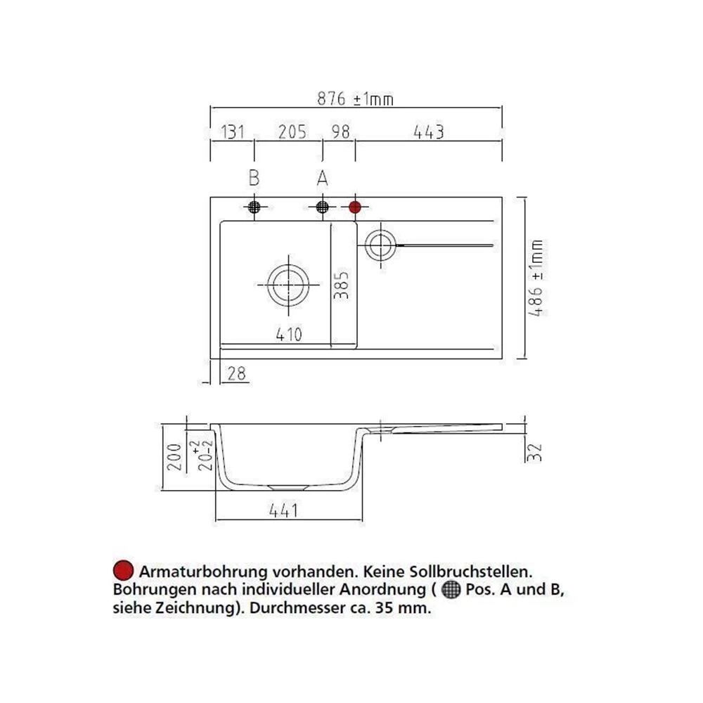 - Spülenmaß: B 876 x T 486 mm