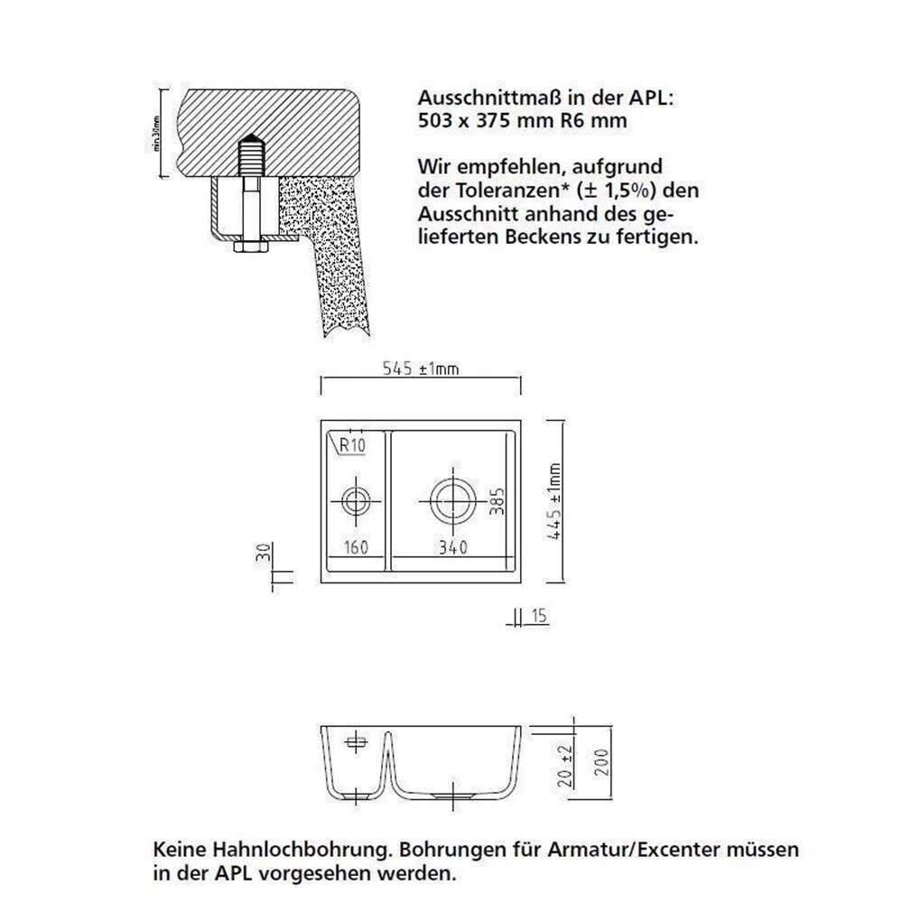 - Beckenabmessung: 340 x 385 x 200 mm / 160 x 385 x 200 mm