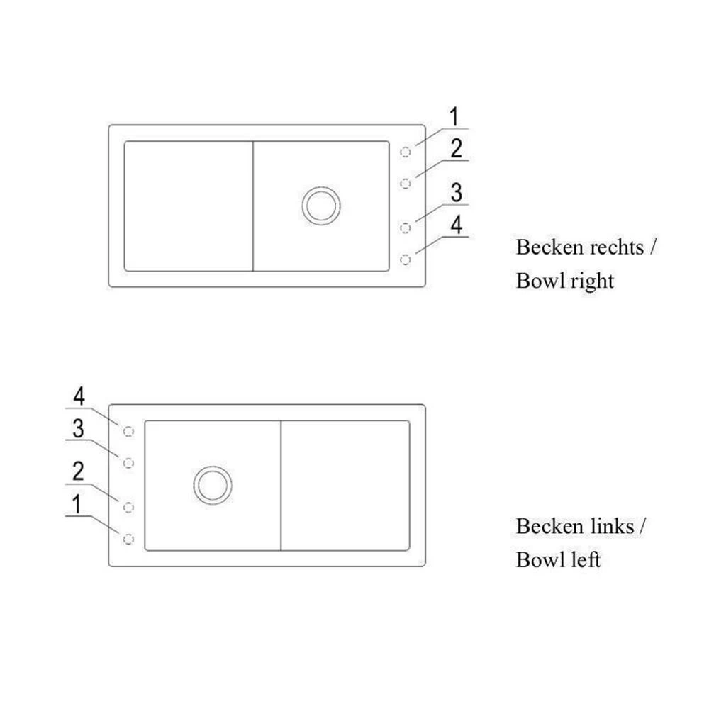 - Zusätzliche Bohrung, zum Beispiel für Spülmittelspender möglich (beachten Sie hierzu die Skizze mit den möglichen Bohrungen)